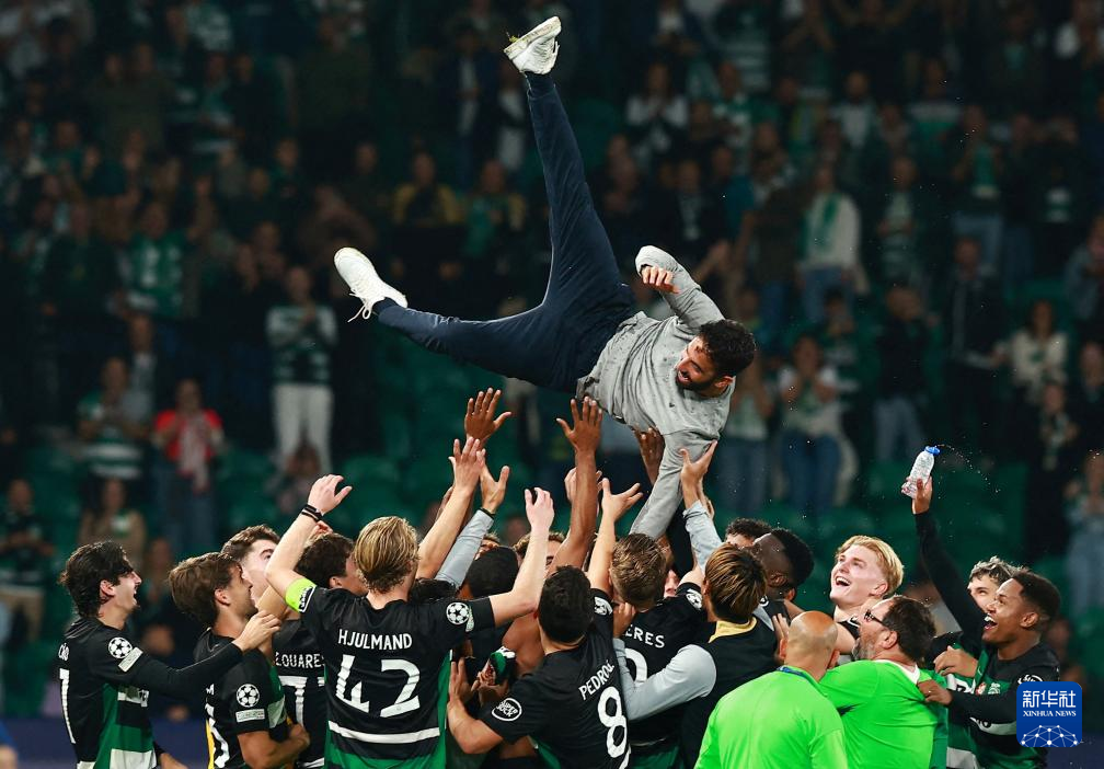 11月5日,葡萄牙体育队球员赛后抛起主教练阿莫林(上)庆祝。