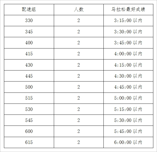 3、有责任心、使命感,配速稳定,每5公里平均领跑配速,误差正负不得超过30秒;完赛成绩误差正负不超过60秒(有配速员领跑经验者优先);