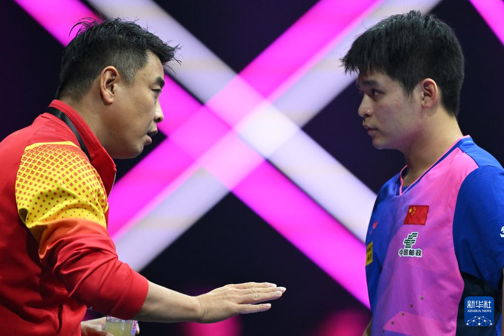 11月7日,教练王皓(左)在比赛间隙指导林诗栋。