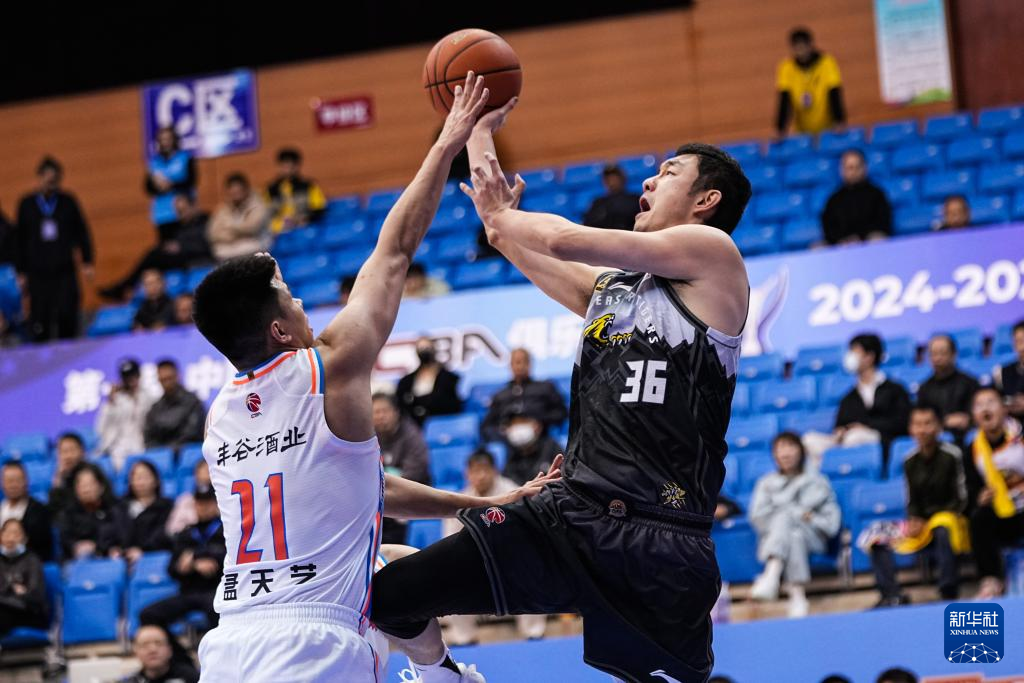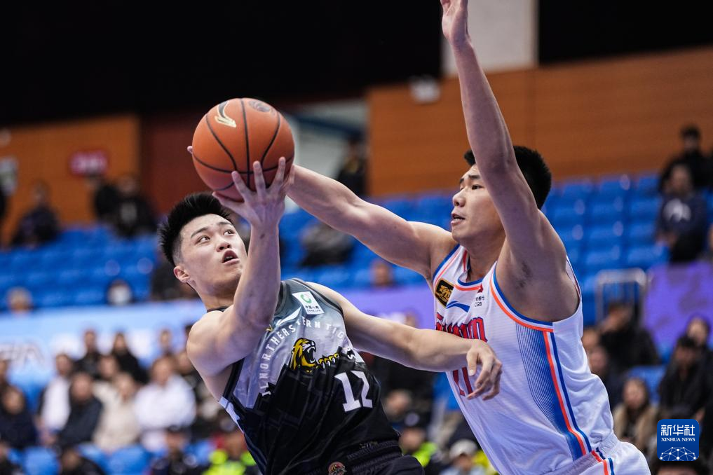 11月12日,吉林九台农商银行队球员吴昌泽(左)与四川丰谷酒业队球员李金效在比赛中拼抢。新华社记者 朱峥 摄