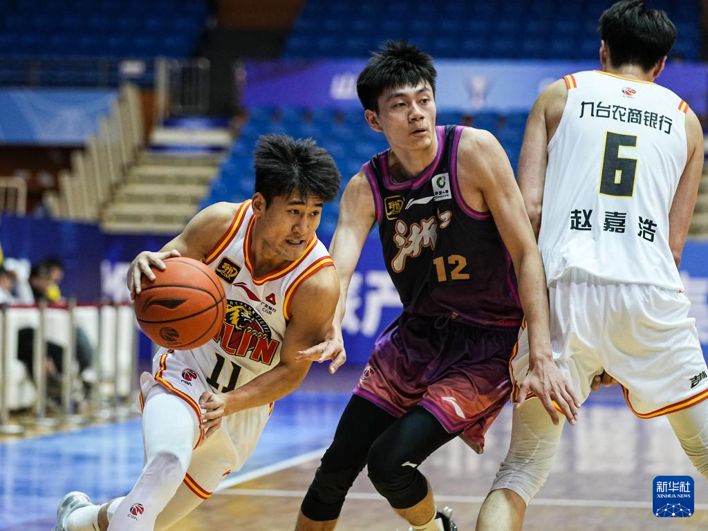 11月13日,吉林九台农商银行队球员姜伟泽(左)在比赛中带球突破。新华社记者 朱峥 摄
