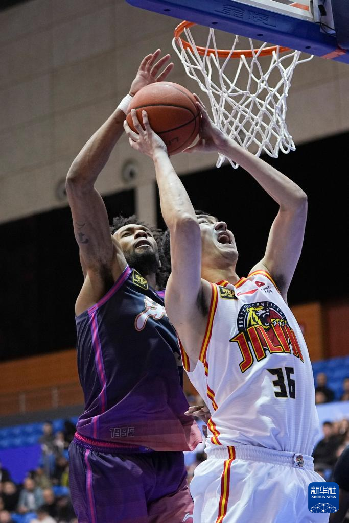 11月13日,吉林九台农商银行队球员赵嘉浩(右)在比赛中上篮。新华社记者 朱峥 摄