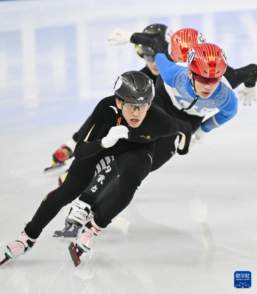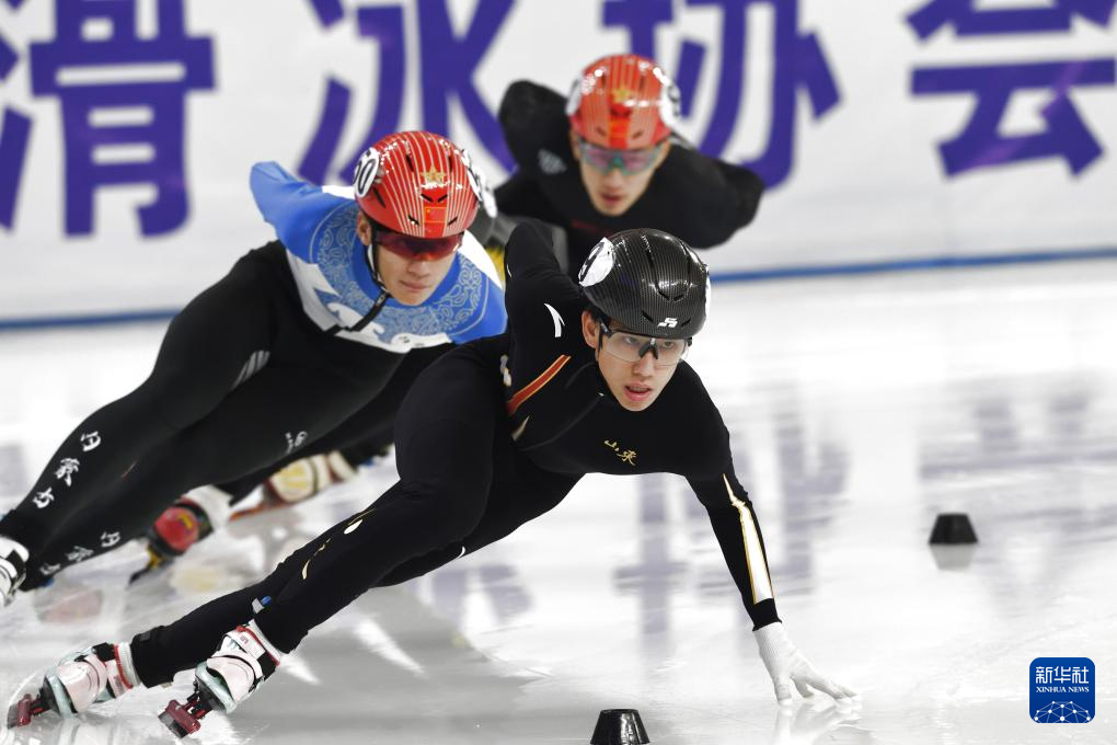 11月14日,山东省冬季运动管理中心选手李鑫宇(前)在男子甲组1500米四分之一决赛中。他晋级半决赛。
