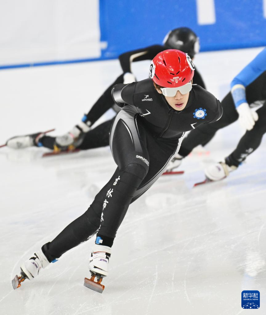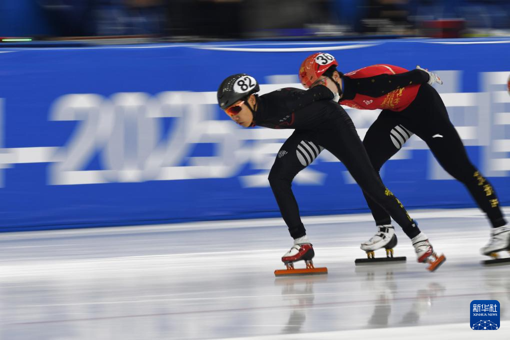11月14日,黑龙江省滑冰协会选手张峻恺(前)在乙组男子500米预赛中。他晋级下一轮。