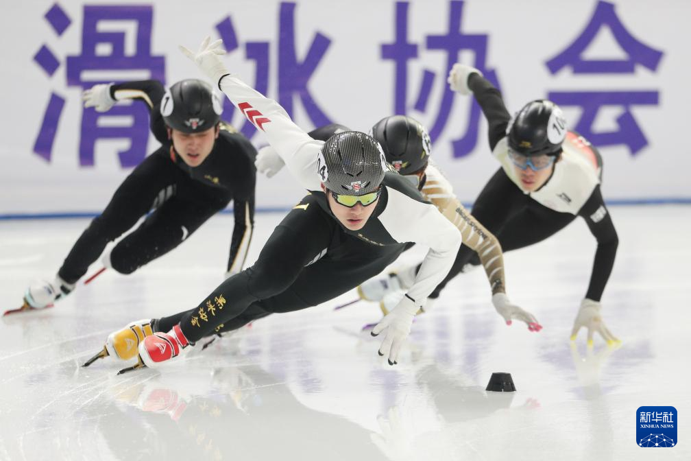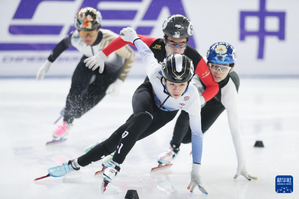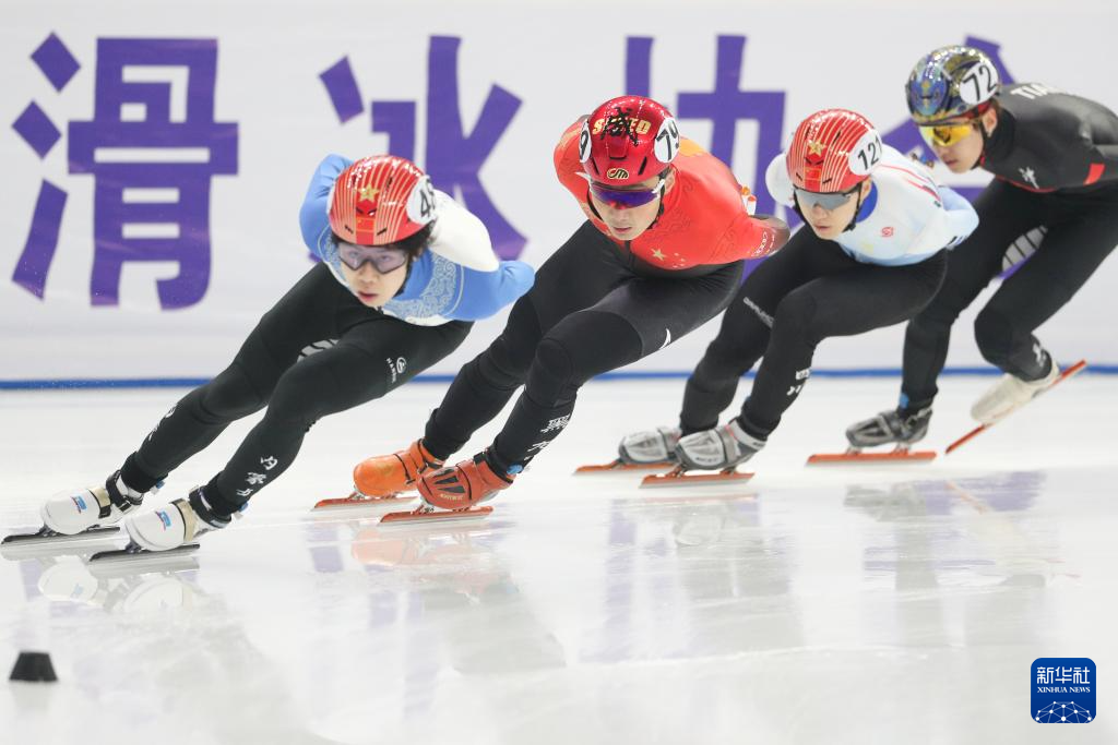 11月14日,哈尔滨市冬季运动项目训练中心选手任子威(左一)在甲组男子1500米四分之一决赛中。他晋级半决赛。