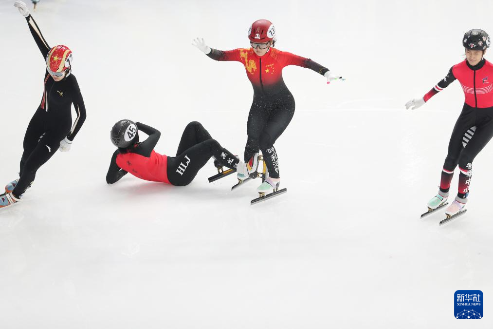 11月14日,黑龙江省冰上训练中心选手孙艺菡(左二)在乙组女子500米预赛冲线后摔倒。她晋级下一轮。