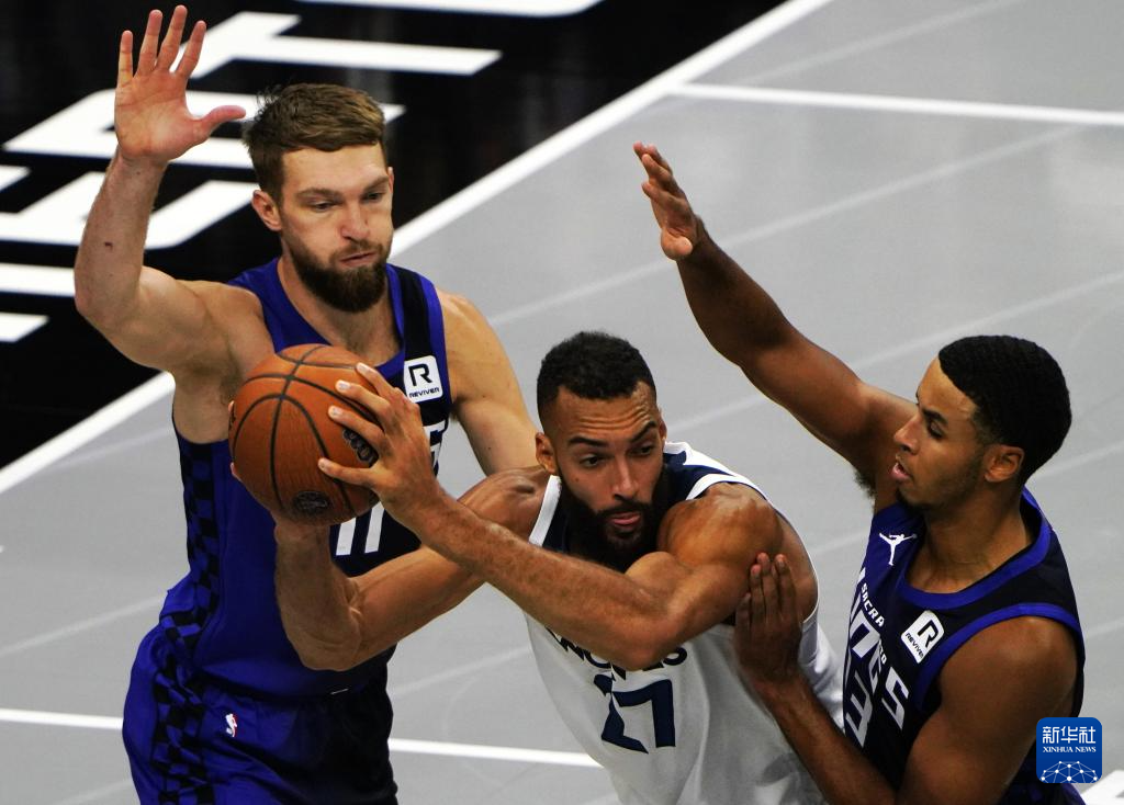 11月15日,森林狼队球员戈贝尔(中)在比赛中进攻。