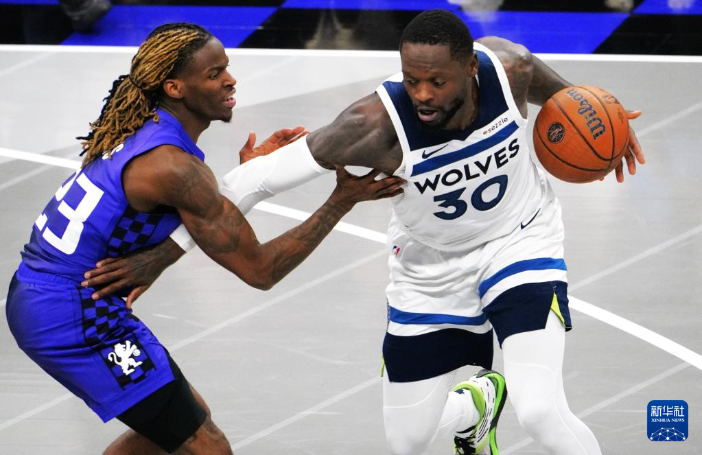 11月15日,森林狼队球员兰德尔(右)在比赛中争抢。