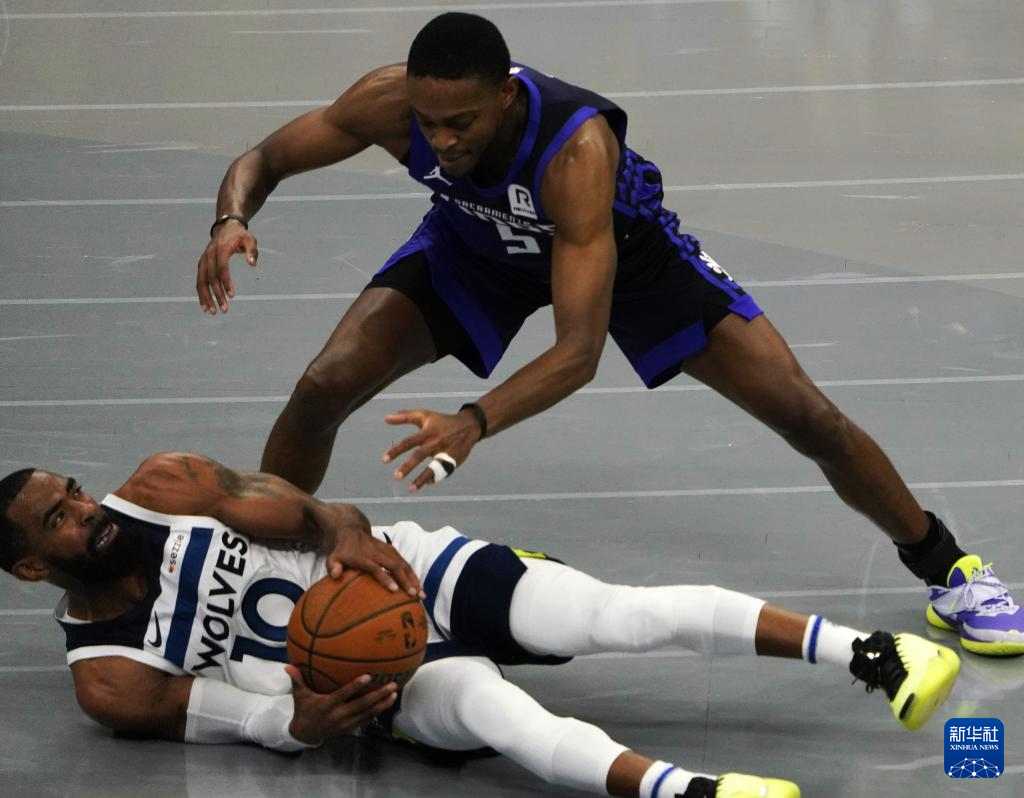 11月15日,国王队球员福克斯(右)与森林狼队球员康利在比赛中争抢。