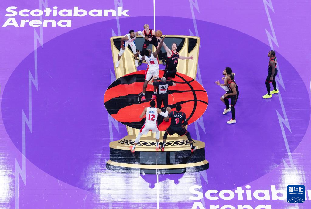 11月15日,猛龙队球员珀尔特尔(上右一)与活塞队球员杜伦(上左三)在比赛中跳球。