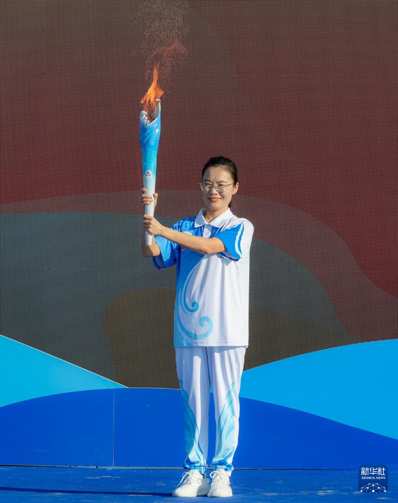 11月17日,火炬手韩晓燕在起跑仪式上与本届运动会吉祥物“吉贝”对接,点燃火炬。