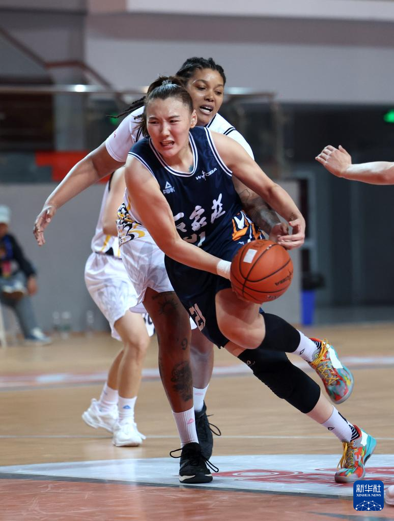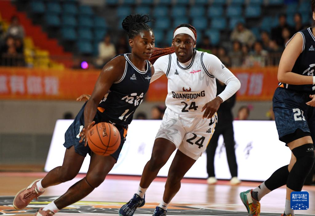 11月16日,石家庄英励队球员崔妮蒂·艾森斯·巴蒂斯特(左)在比赛中面对东莞新彤盛队球员阿莉娅·科利尔的防守。