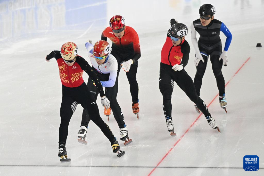 11月16日,钟宇晨(左一)、李佳奇(左二)、沈俊博(中)和哈尔滨市冬季运动项目训练中心选手任子威(右二)在比赛中。任子威获得第四名。