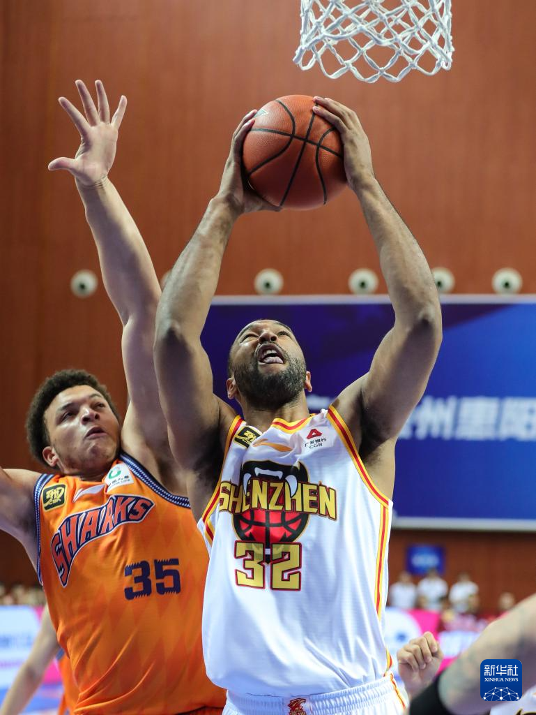 11月16日,深圳马可波罗队球员贺希宁(右)在上海久事队球员洛夫顿的防守下投篮。