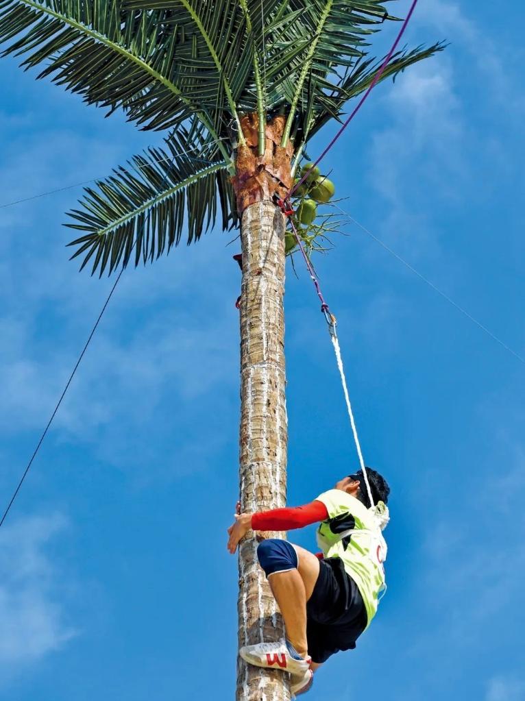 攀椰竞速源于海南当地群众爬树摘椰的生活劳作场景。