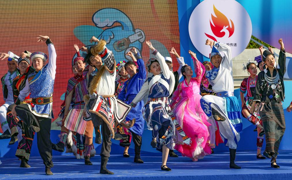 11月17日,演员在第十二届全国少数民族传统体育运动会火炬实地传递活动起跑仪式上表演。新华社记者 陈朔 摄