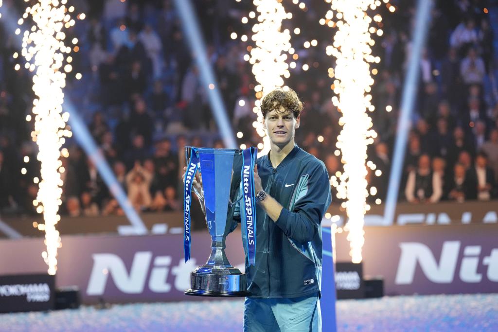 11月17日,辛纳在颁奖仪式上与冠军奖杯合影。新华社记者 李京 摄