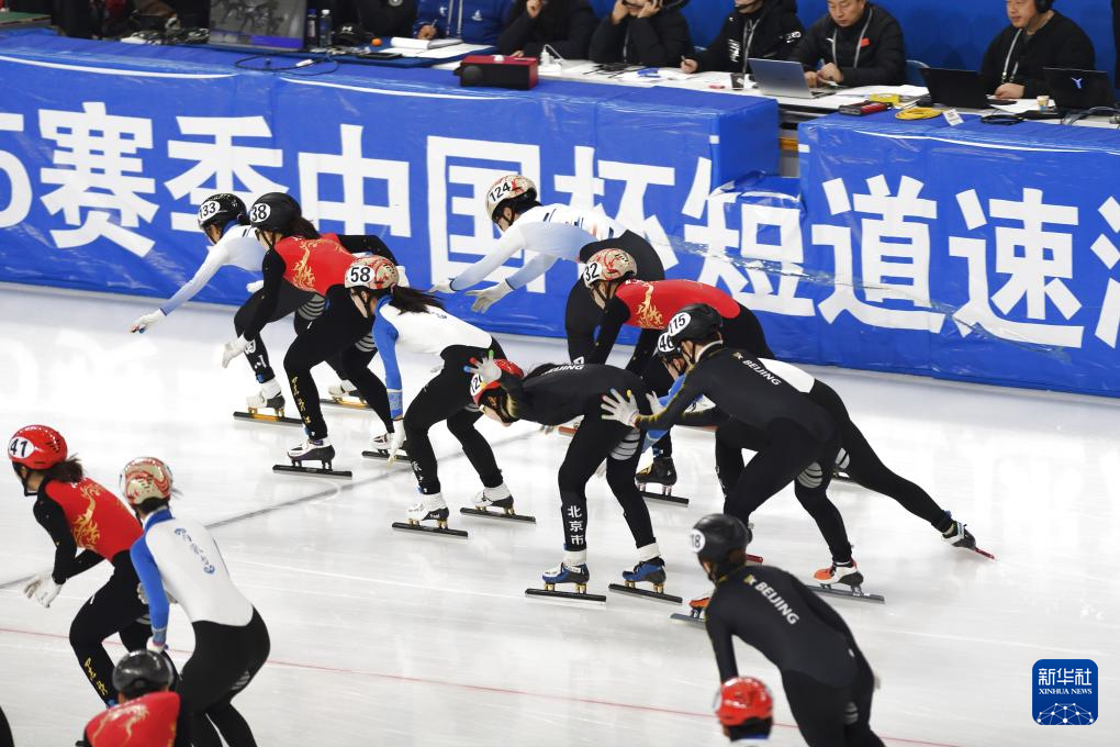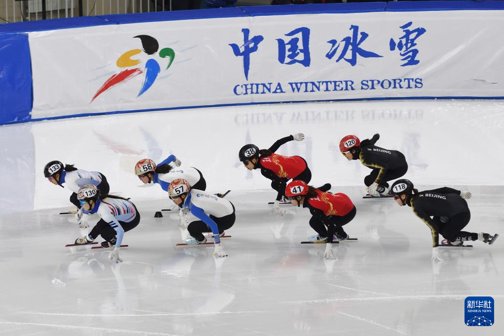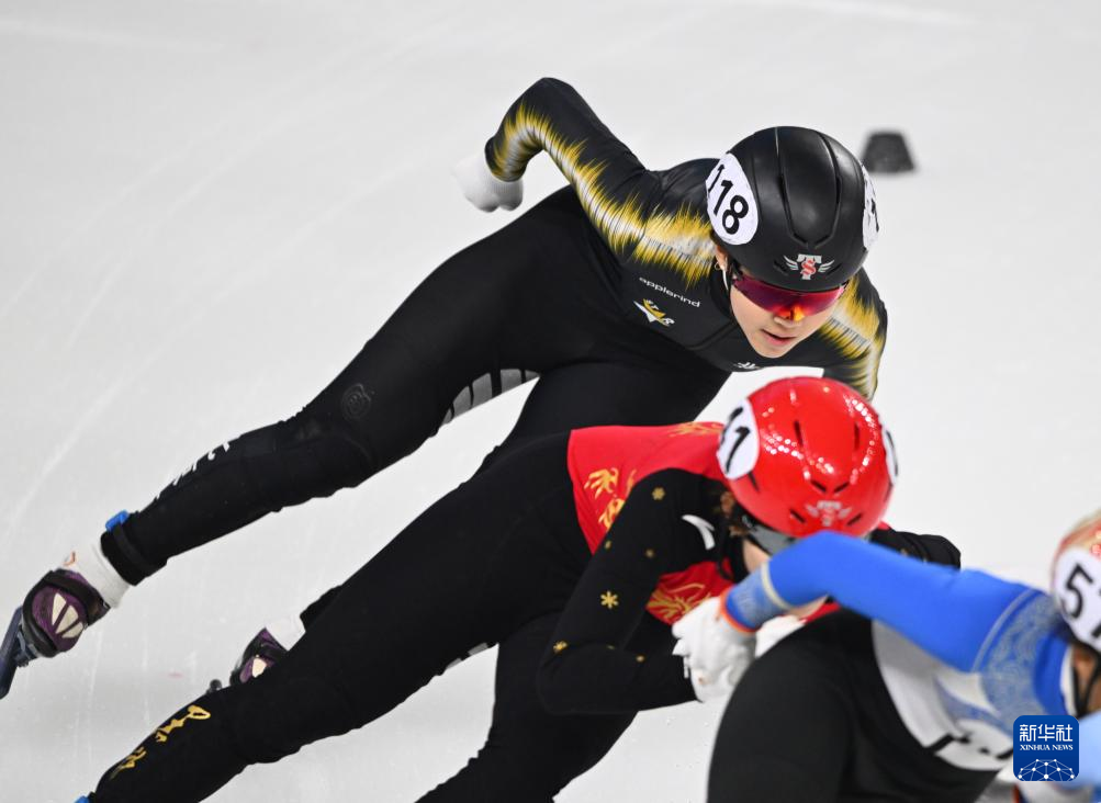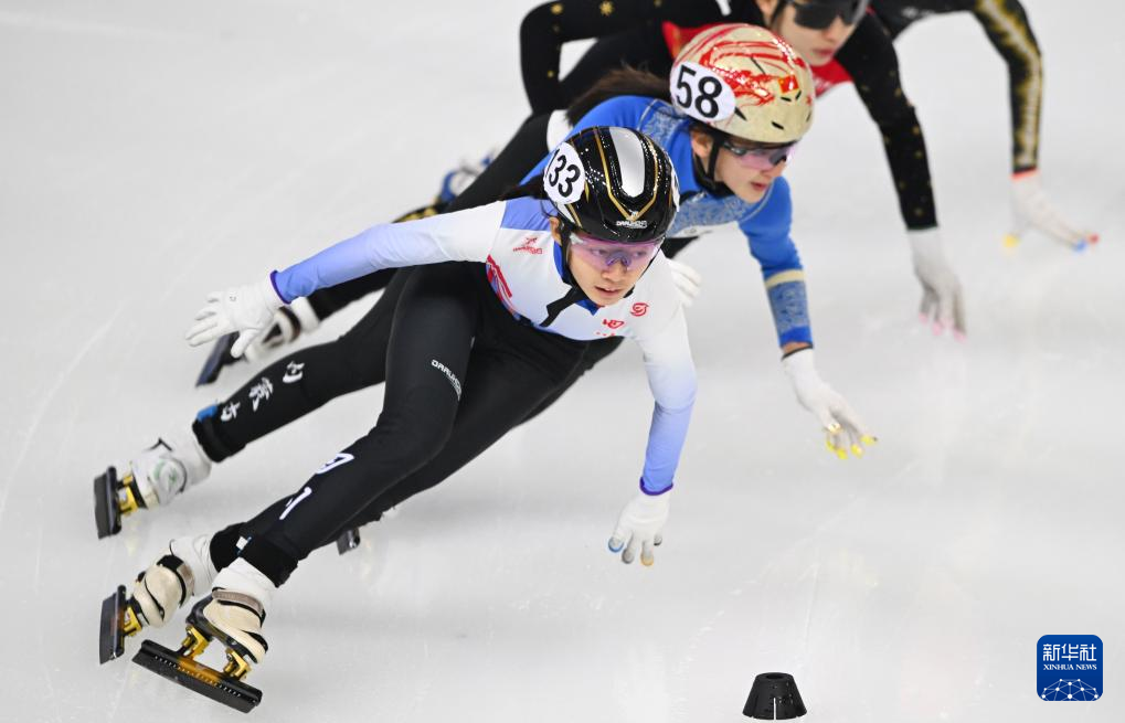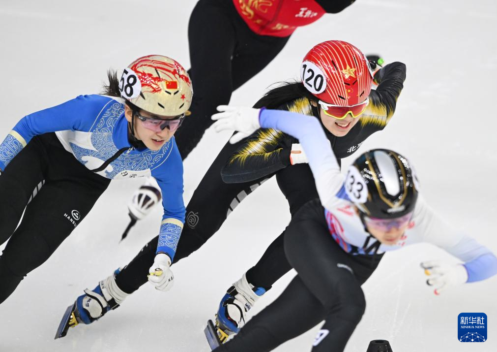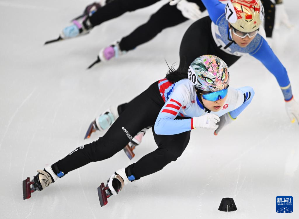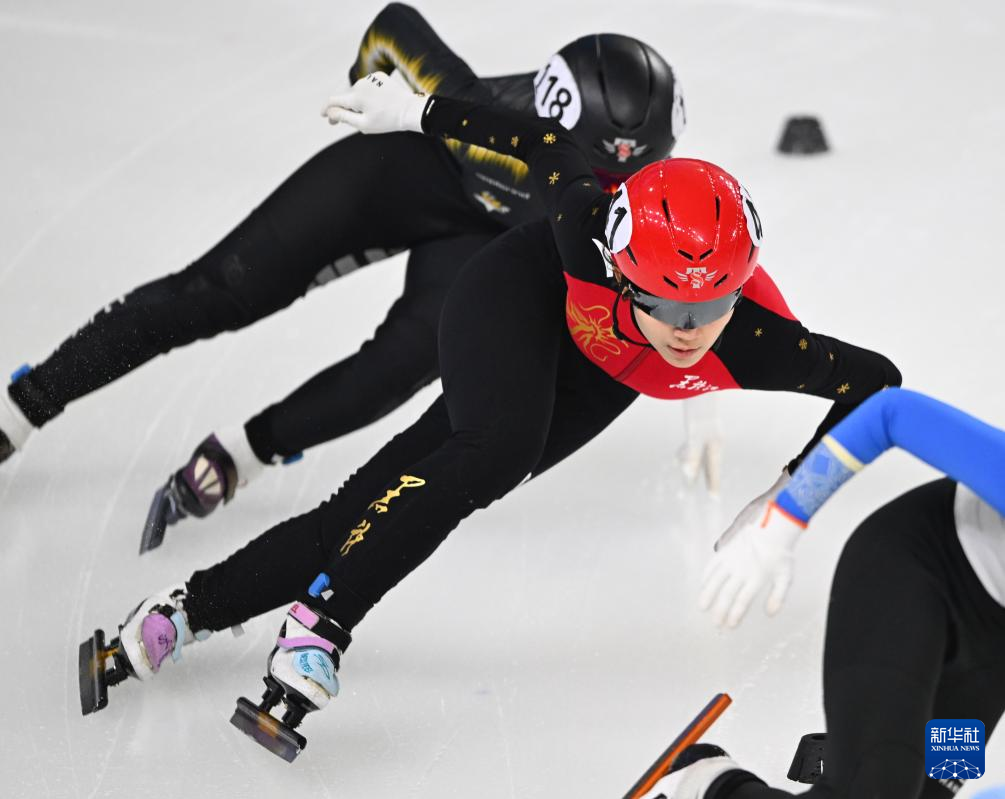 11月17日,黑龙江省冰上训练中心代表队选手张澜馨(中)在比赛中。