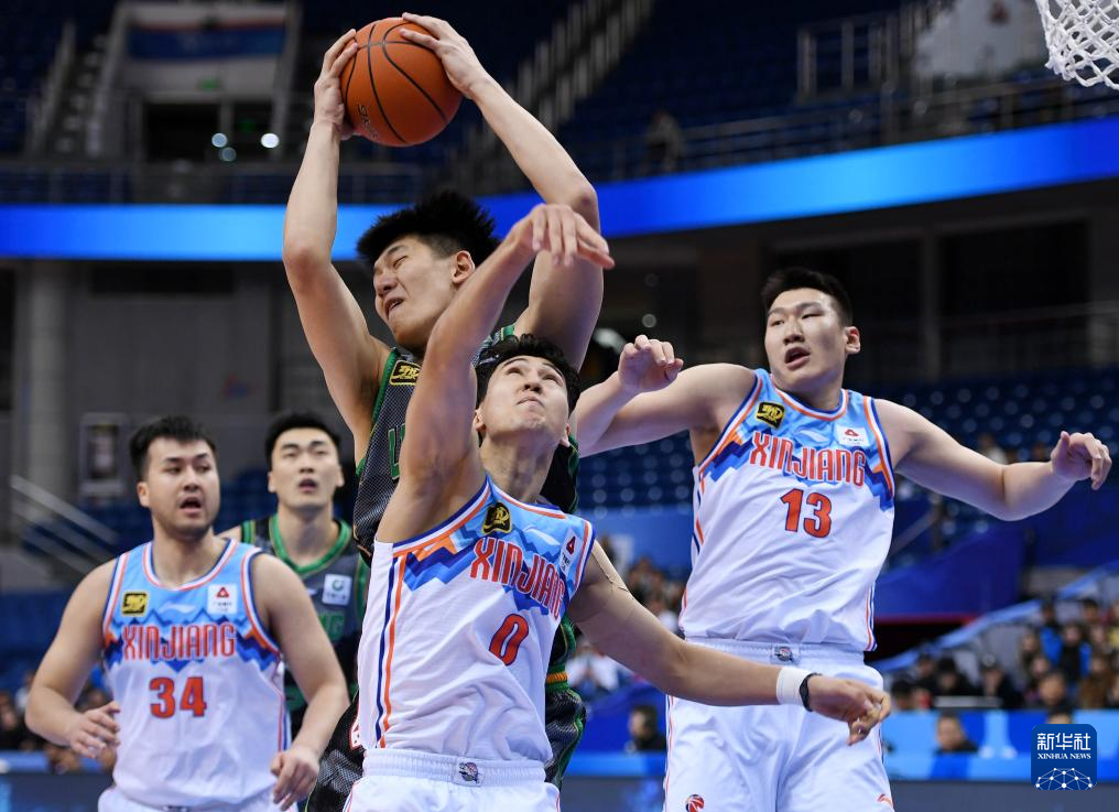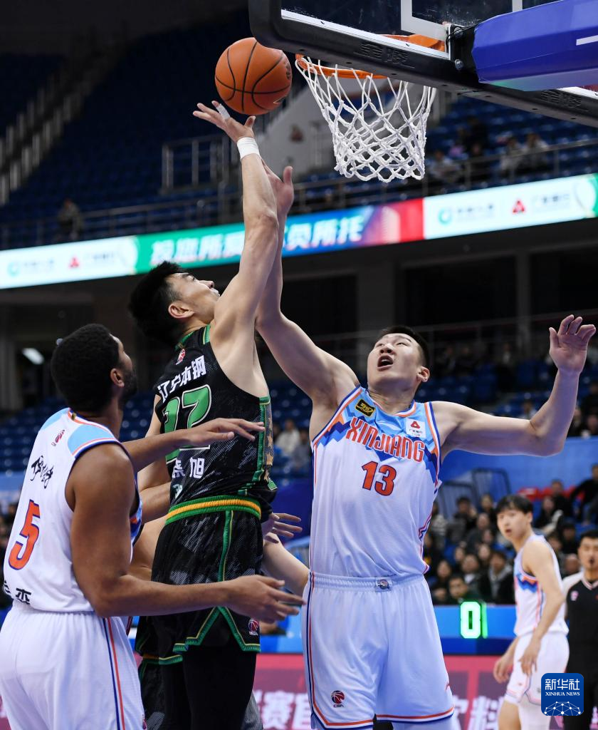 11月17日,新疆伊力特队球员李炎哲(前右)在比赛中防守辽宁本钢队球员李晓旭(前中)投篮。