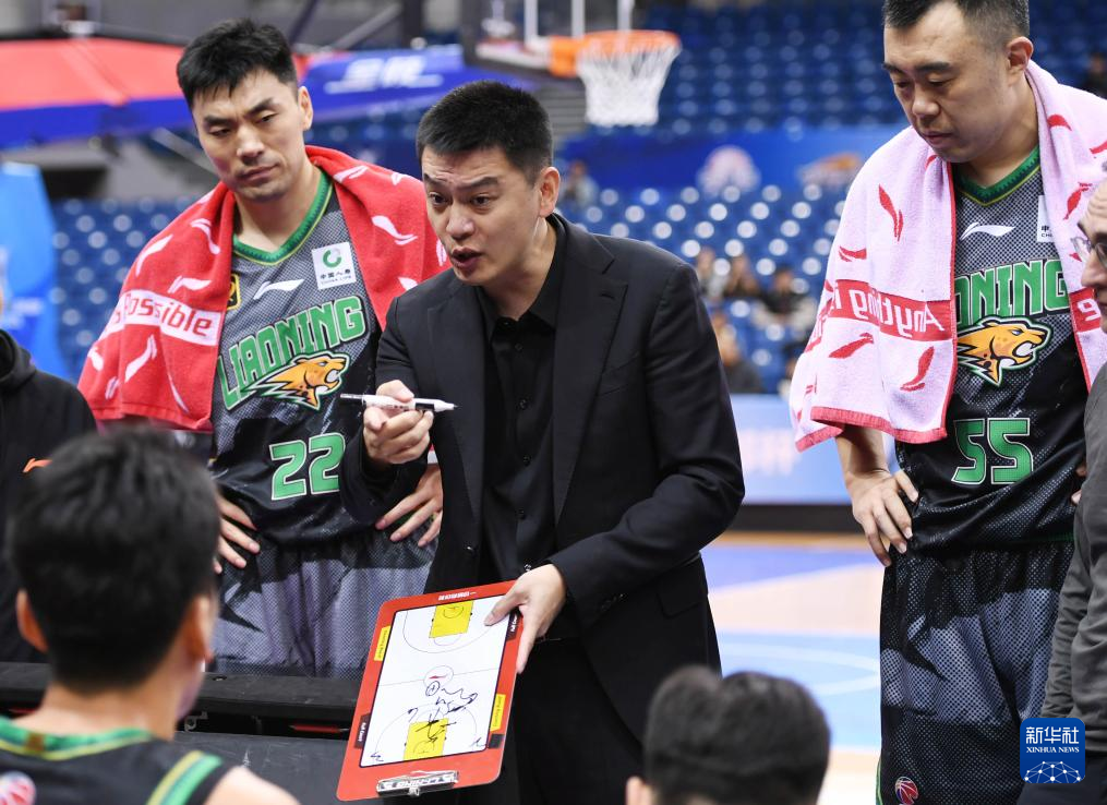 11月17日,辽宁本钢队主教练杨鸣(中)在比赛间隙向队员布置战术。