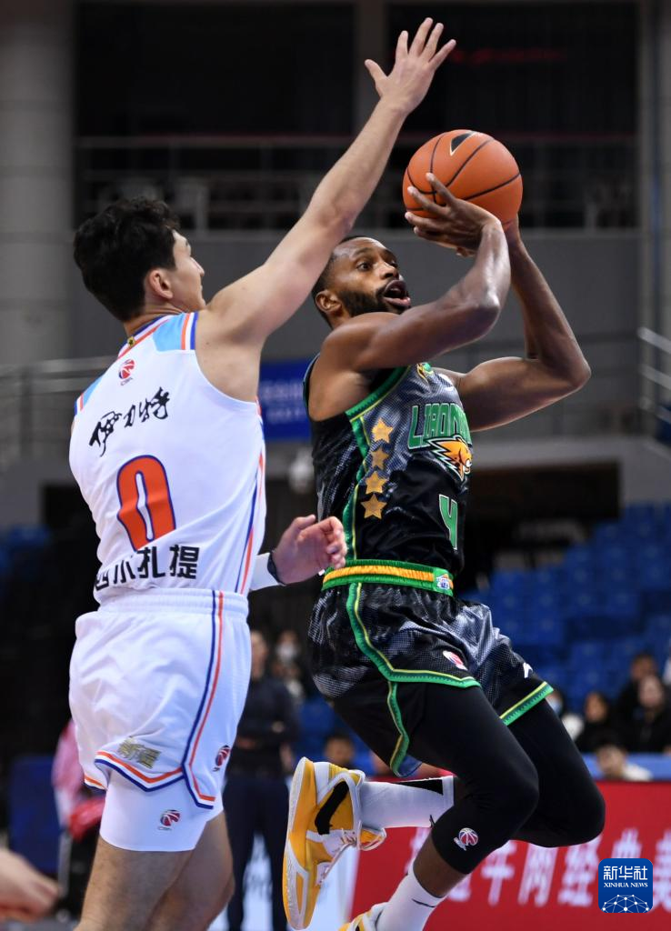 11月17日,新疆伊力特队球员艾孜麦提(前左)在比赛中防守辽宁本钢队球员张陈治锋(前右)投篮。