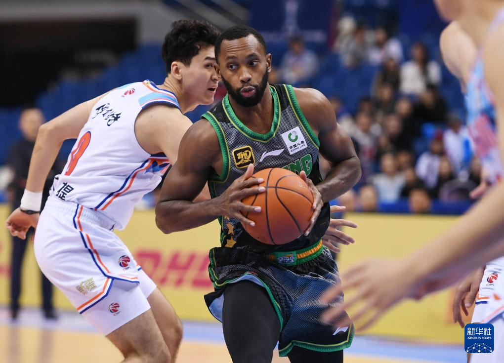 11月17日,辽宁队球员张陈治锋(上)在比赛中拼抢。
