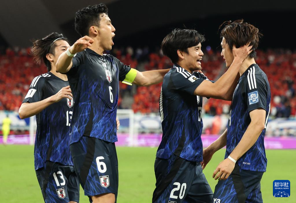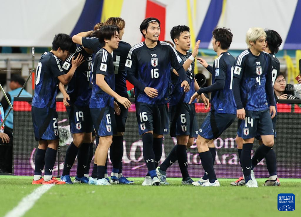11月19日,日本队球员庆祝进球。新华社记者 贾浩成 摄