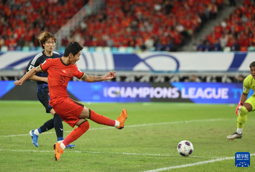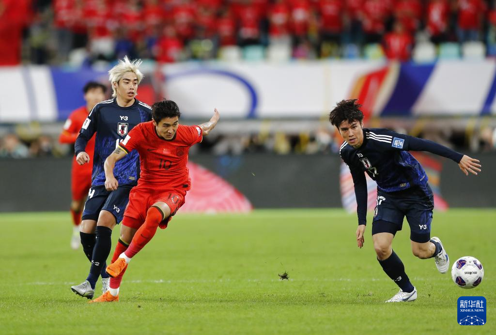 11月19日,中国队球员谢文能(左)与日本队球员伊东纯也拼抢。新华社记者 贾浩成 摄