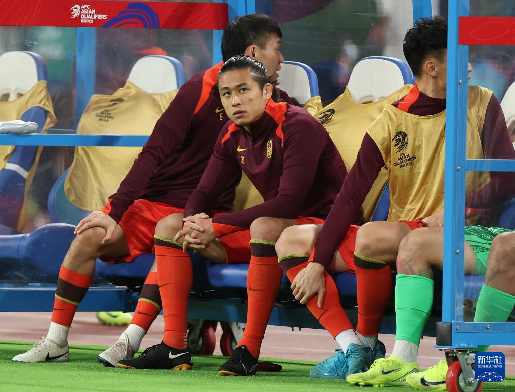 11月19日,中国队球员张玉宁(中)在替补席上。新华社记者 曹灿 摄