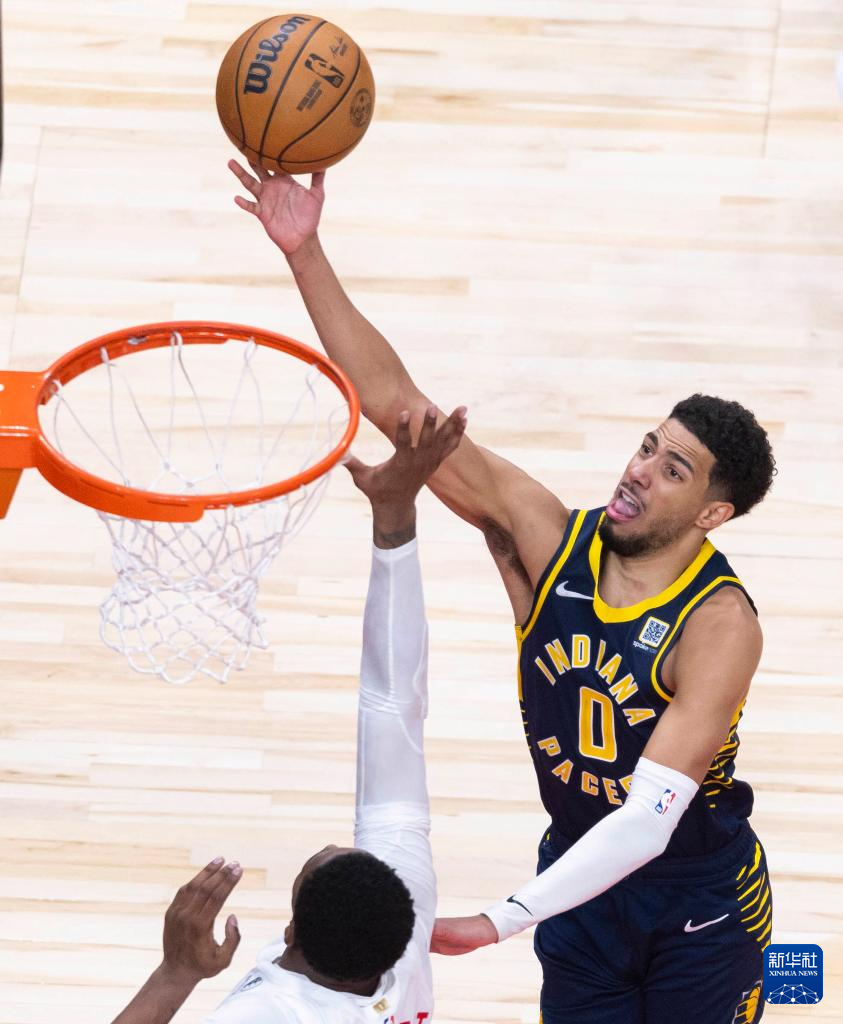 11月18日,步行者队球员哈利伯顿(右)在比赛中上篮。