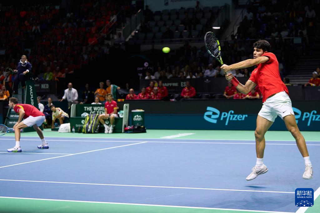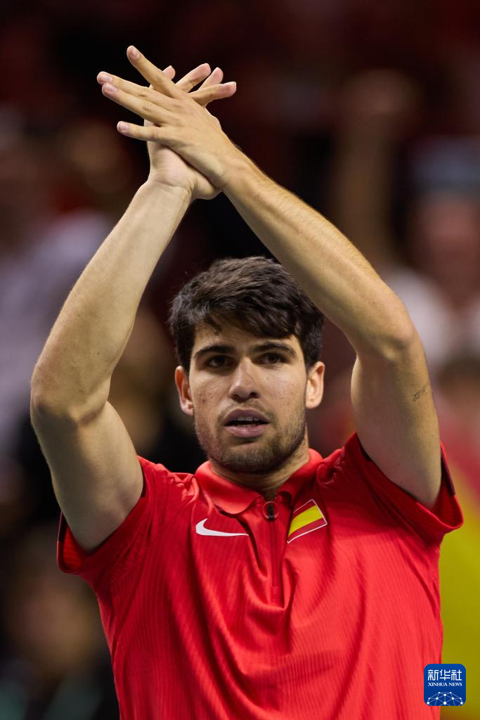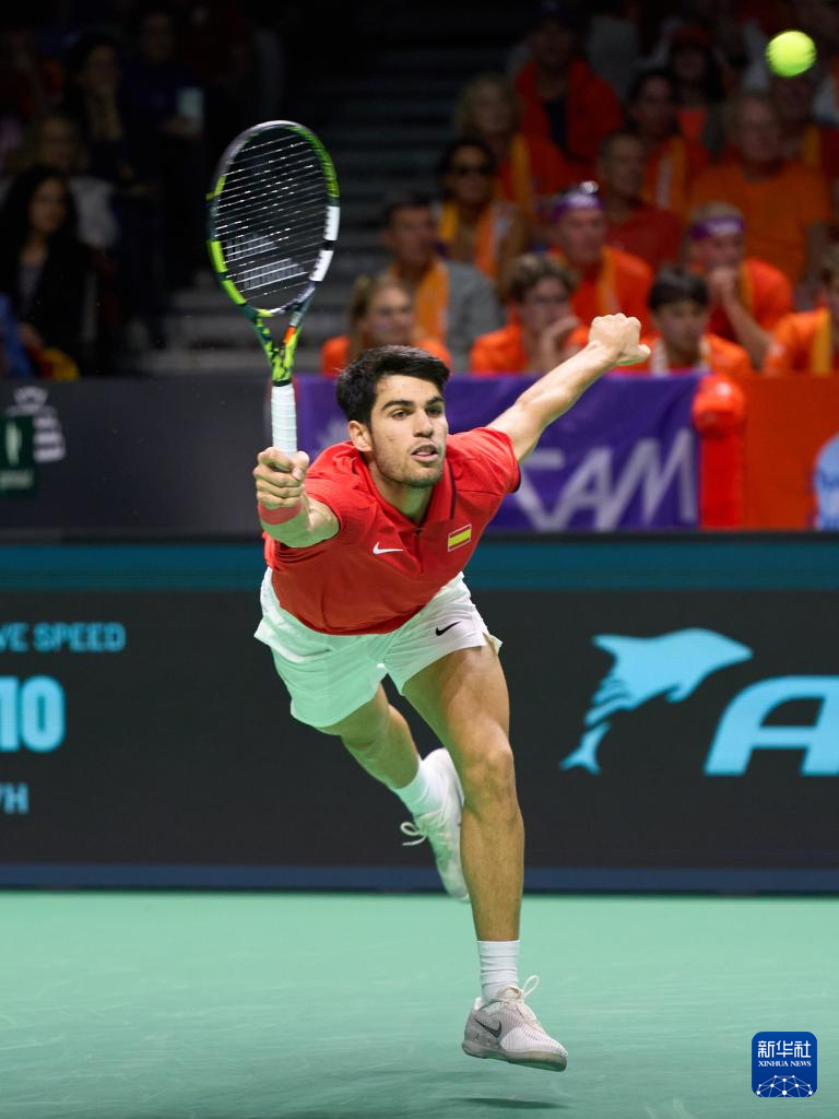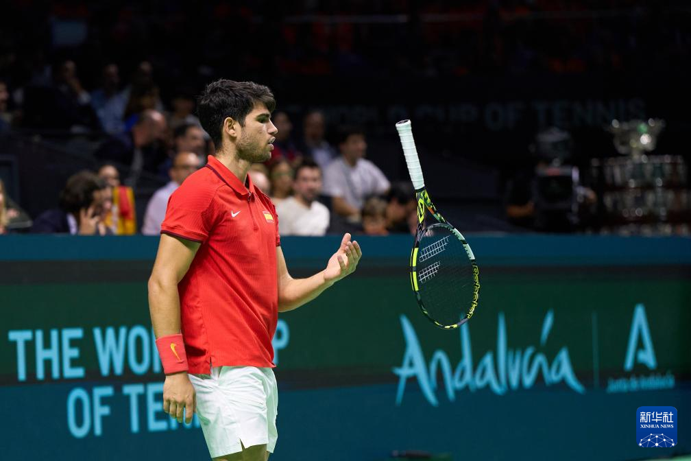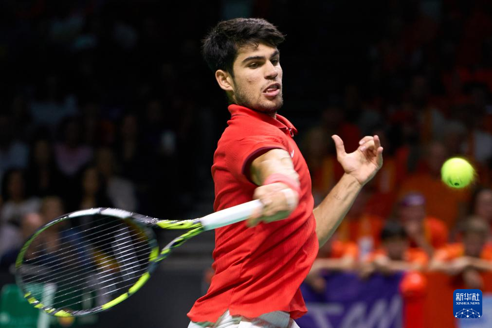 11月19日,西班牙队选手阿尔卡拉斯在比赛中,他2比0战胜荷兰队选手塔隆·格里克斯普尔。新华社记者 孟鼎博 摄
