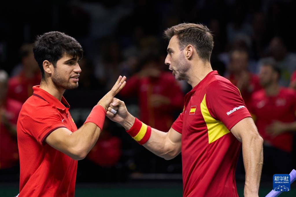 11月19日,西班牙队组合阿尔卡拉斯(右)/格拉诺列尔斯在比赛中,他们0比2不敌荷兰组合库尔霍夫/范德赞德舒尔普。新华社记者 孟鼎博 摄