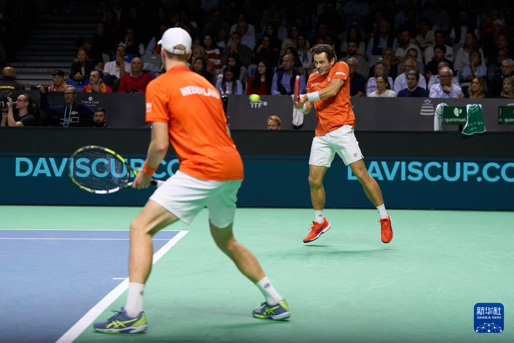 11月19日,荷兰组合库尔霍夫(右)/范德赞德舒尔普在比赛中,他们2比0战胜西班牙队组合阿尔卡拉斯/格拉诺列尔斯。新华社记者 孟鼎博 摄