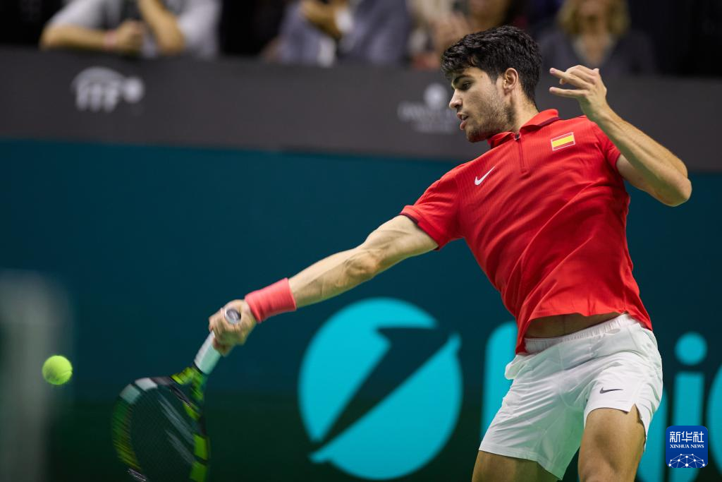 11月19日,西班牙队选手阿尔卡拉斯在比赛中回球,他2比0战胜荷兰队选手塔隆·格里克斯普尔。新华社记者 孟鼎博 摄
