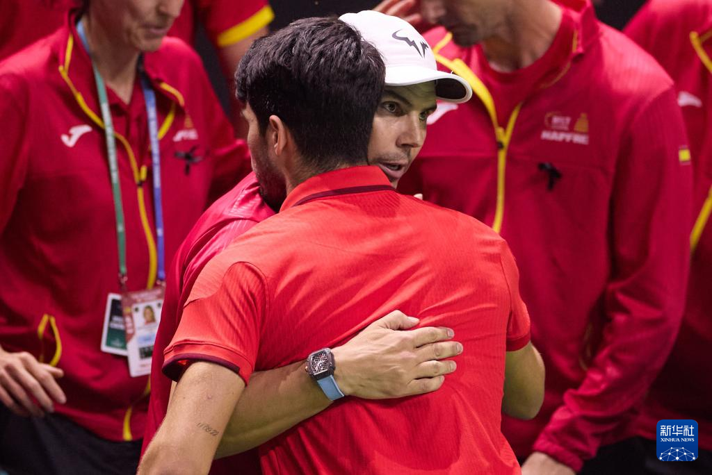 11月19日,西班牙队选手纳达尔(右)在比赛间隙拥抱队友阿尔卡拉斯。新华社记者 孟鼎博 摄