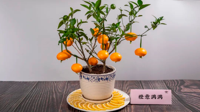 橙压枝弯硕果累,满树尽带黄金甲。取邻水优质脐橙的汁与高筋面粉、花生、芝麻、桃仁、红糖、鸡蛋清等充分糅合,制作成形似脐橙的袖珍品,此肴入席之际,树上的“脐橙”会轻轻摇动,意喻橙意满满、笑迎宾至。