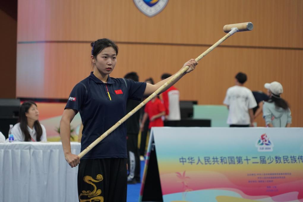 11月21日,在第十二届全国少数民族传统体育运动会民族武术项目的场馆里,金善瑛正在试赛。