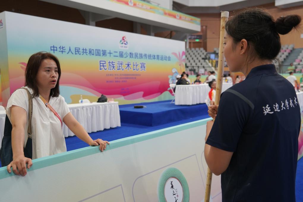 11月21日,在第十二届全国少数民族传统体育运动会民族武术项目场馆里,金红兰(左)在场边指导运动员金善瑛。