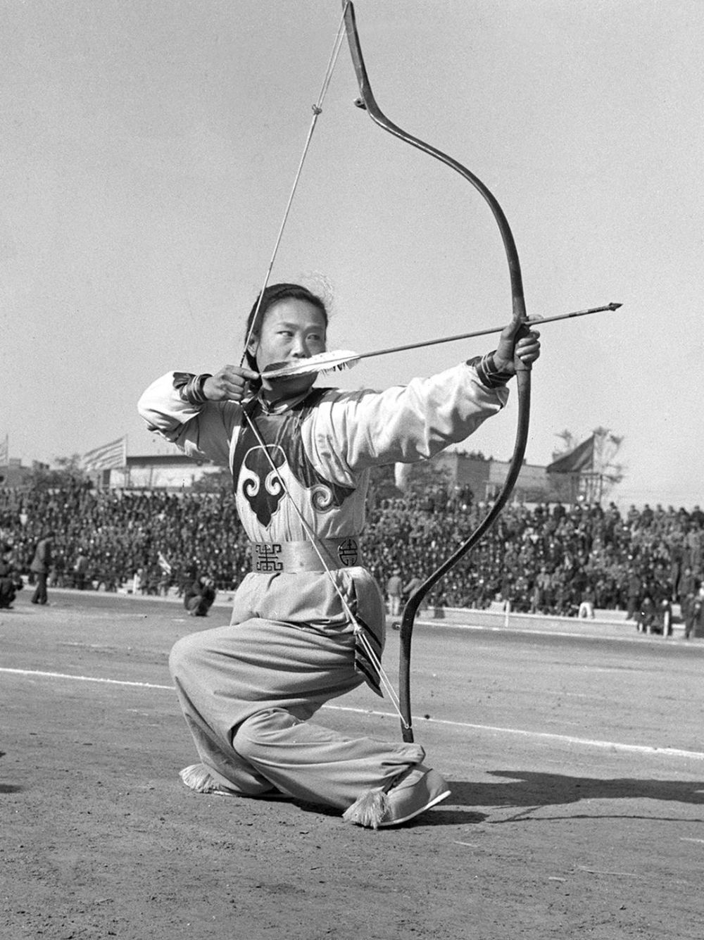 华北区代表马瑞兰在1953年全国民族形式体育表演及竞赛大会上表演步射(1953年11月摄)。