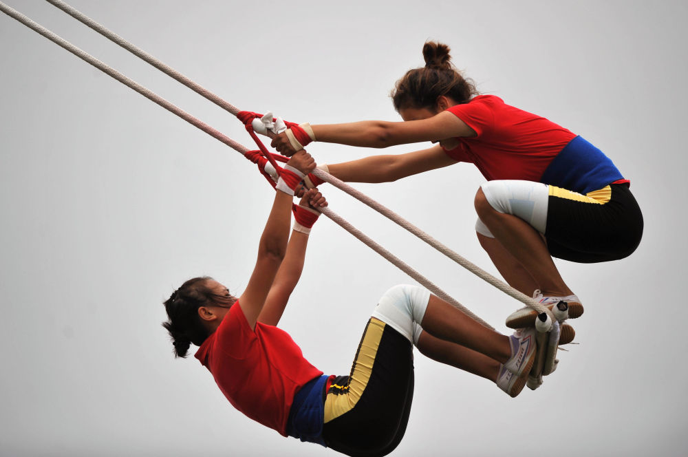 2011年9月11日,贵州队选手在第九届全国少数民族传统体育运动会秋千项目比赛中。