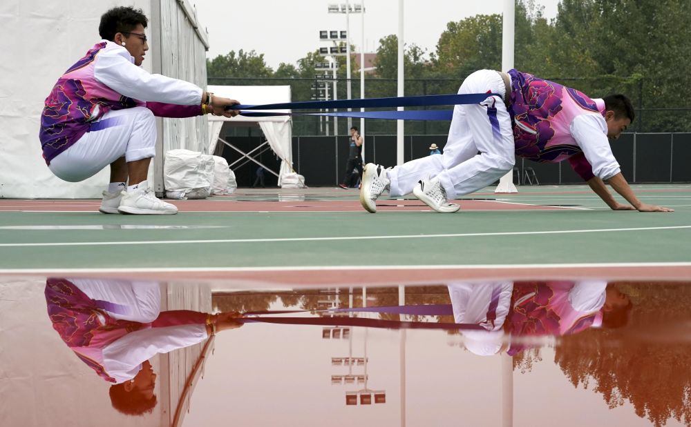 2019年9月10日,运动员在第十一届全国少数民族传统体育运动会押加比赛前热身。押加比赛来源于牛拉犁时奋力向前的劳作过程。