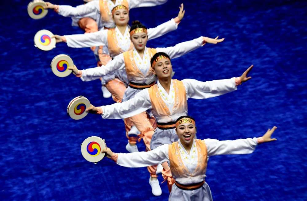 吉林代表队在2019年第十一届全国少数民族传统体育运动会民族健身操比赛中。