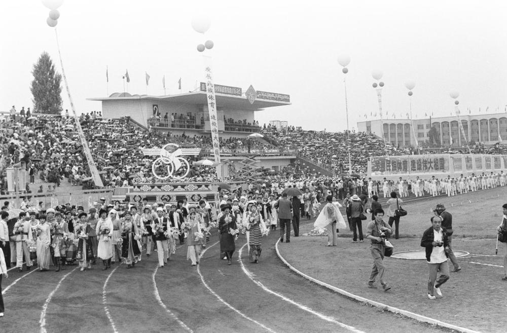 1986年第三届全国少数民族传统体育运动会入场式。本届运动会首次启用了会徽、会旗、会标。