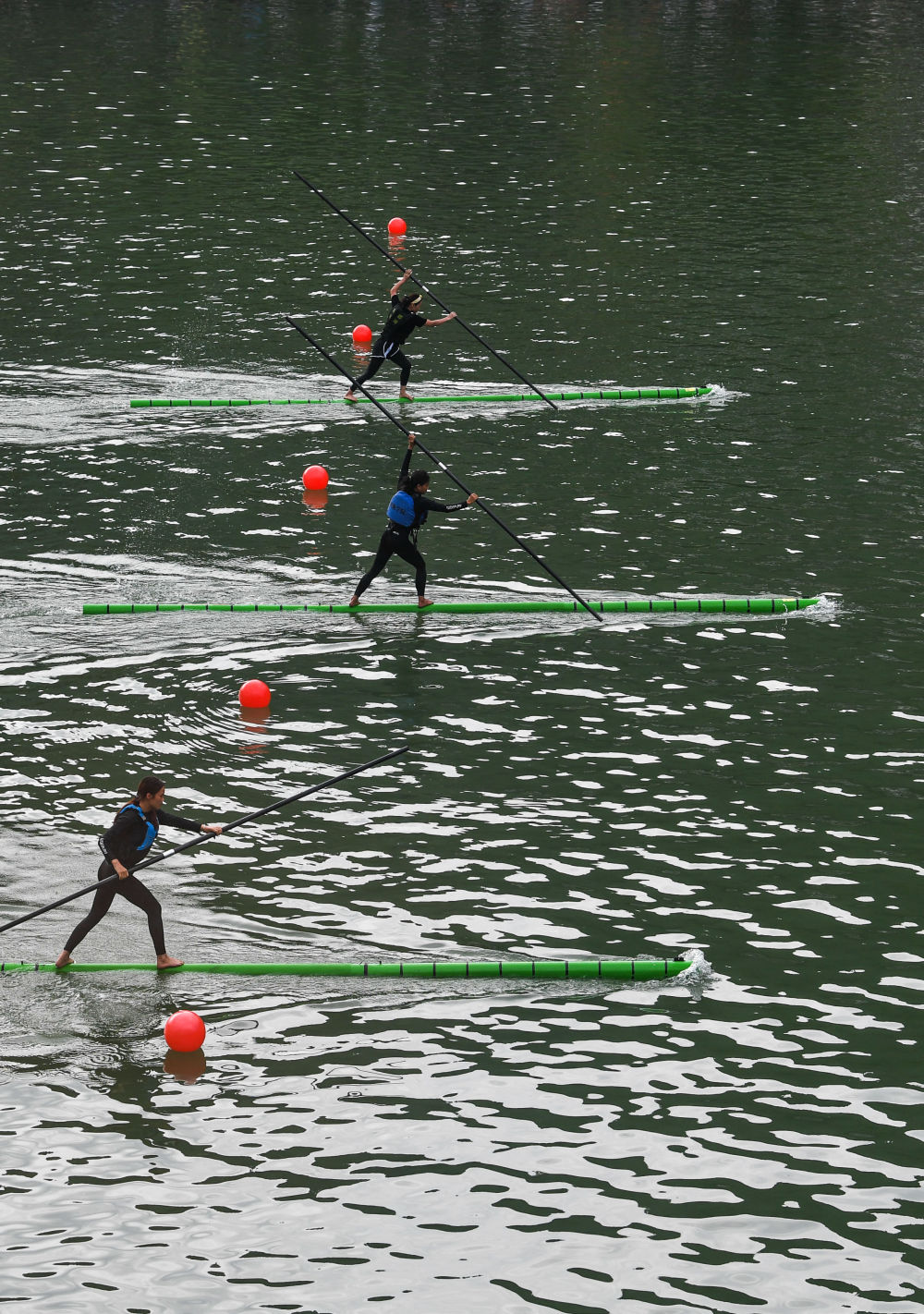 2024年民体杯全国龙舟、独竹漂比赛中,参赛队员在进行独竹漂比赛。