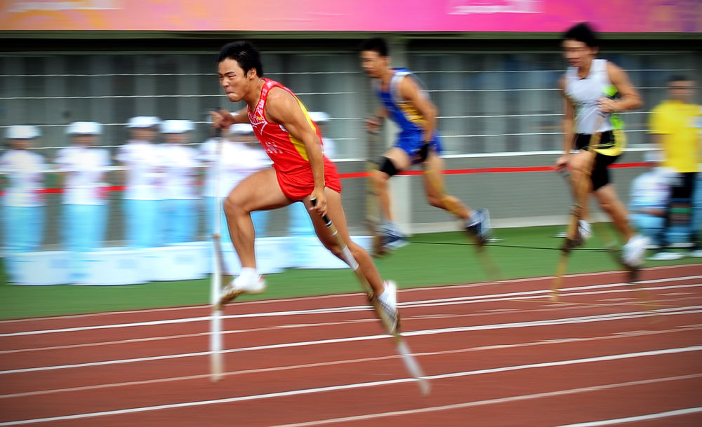 参赛选手在2011年第九届全国少数民族传统体育运动会高脚竞速比赛中。