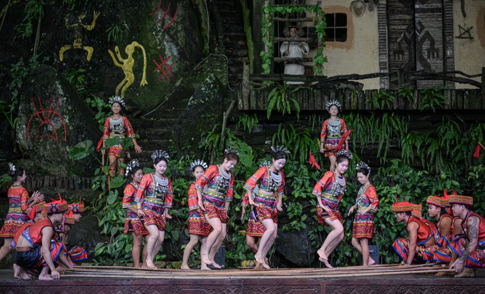11月4日,在海南保亭槟榔谷文化旅游区拍摄的黎族打柴舞表演。
