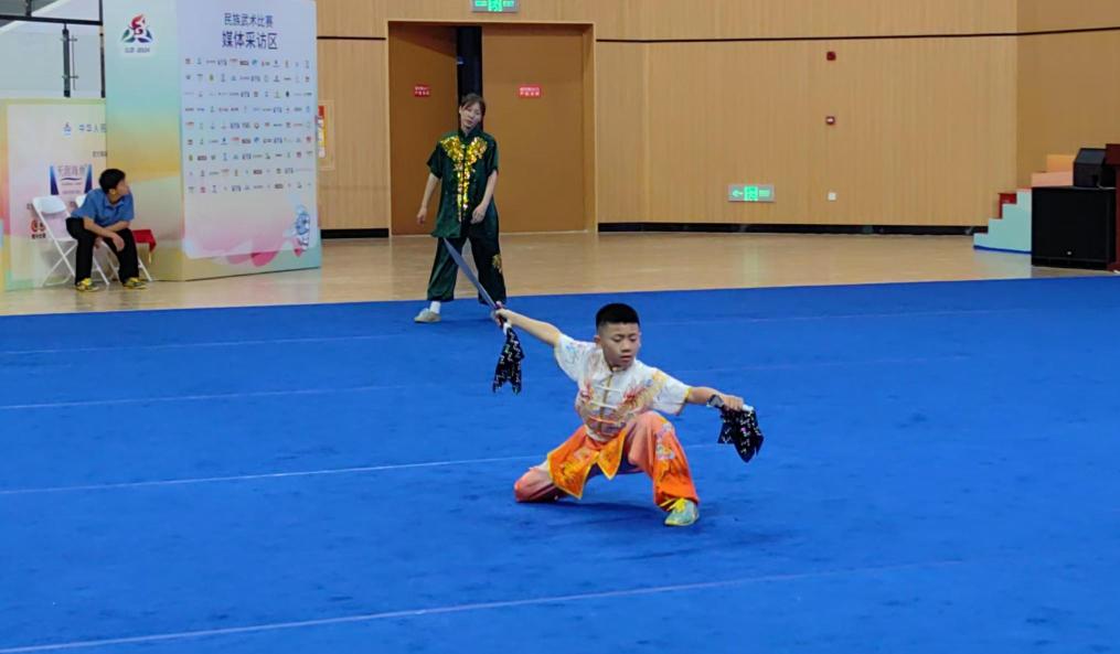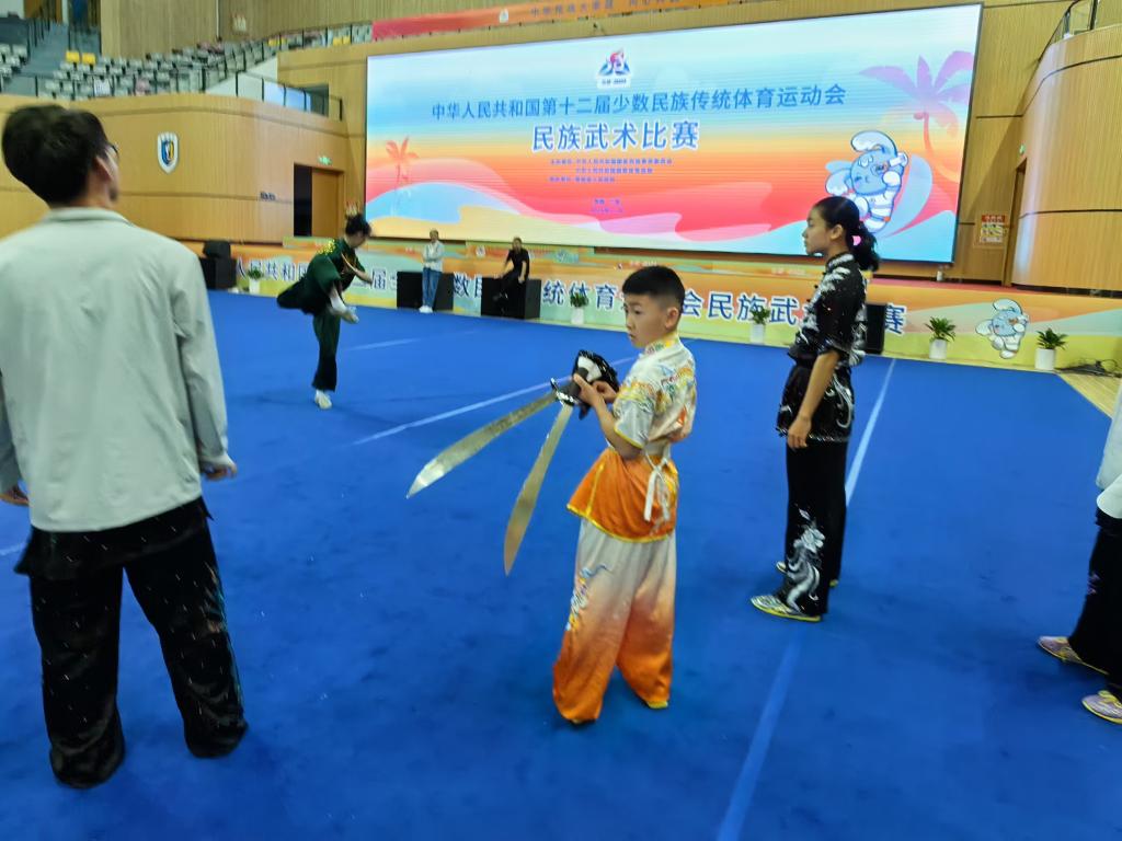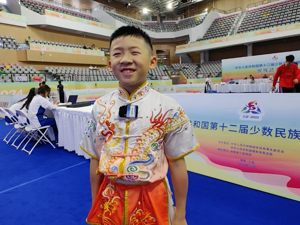 新华社三亚11月22日电(记者周欣、焦子琦)“我叫卢子骏,10岁,来自新疆乌鲁木齐,汉族,比赛的项目是双刀!”作为新疆生产建设兵团代表团在第十二届全国少数民族传统体育运动会中年龄最小的参赛选手,卢子骏刚开始说话时还有点拘谨,但聊起武术很快就自信了起来。