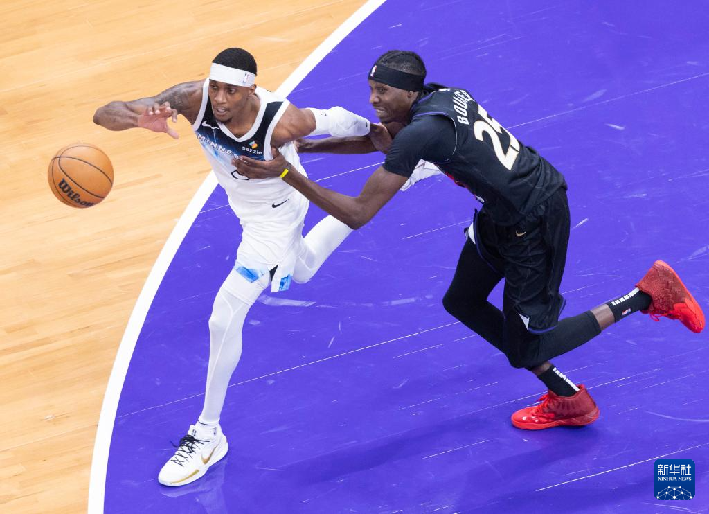 11月21日,森林狼队球员戈贝尔(中)在比赛中扣篮。