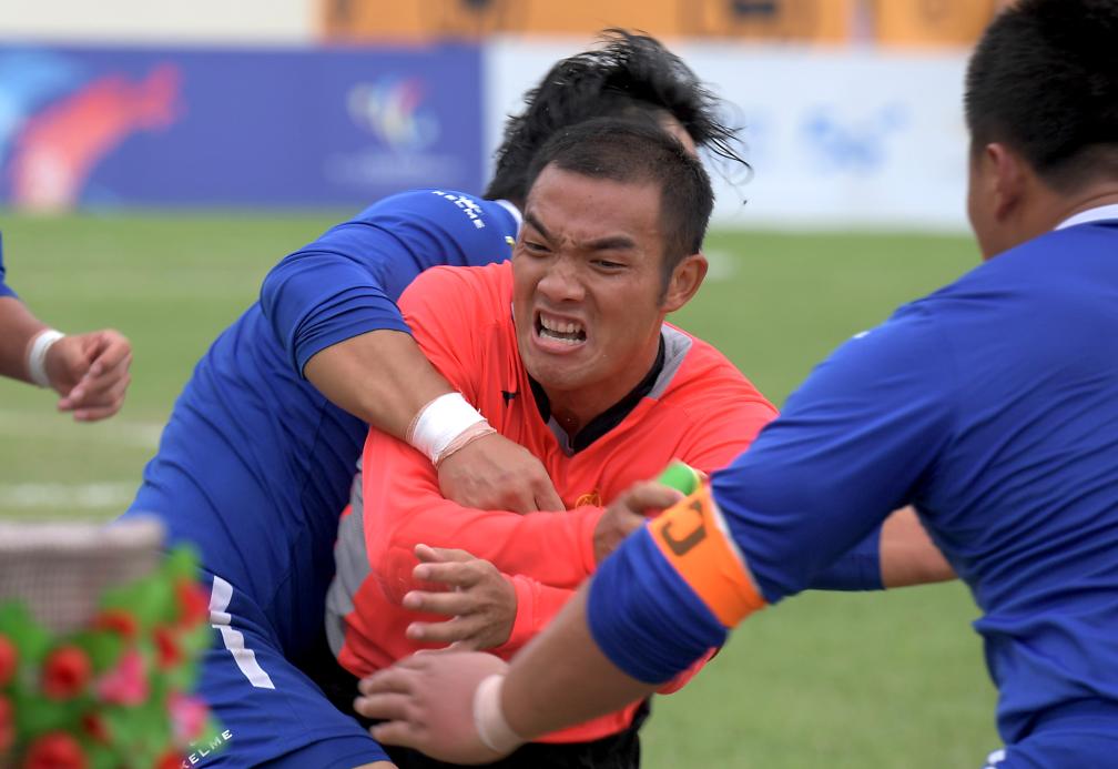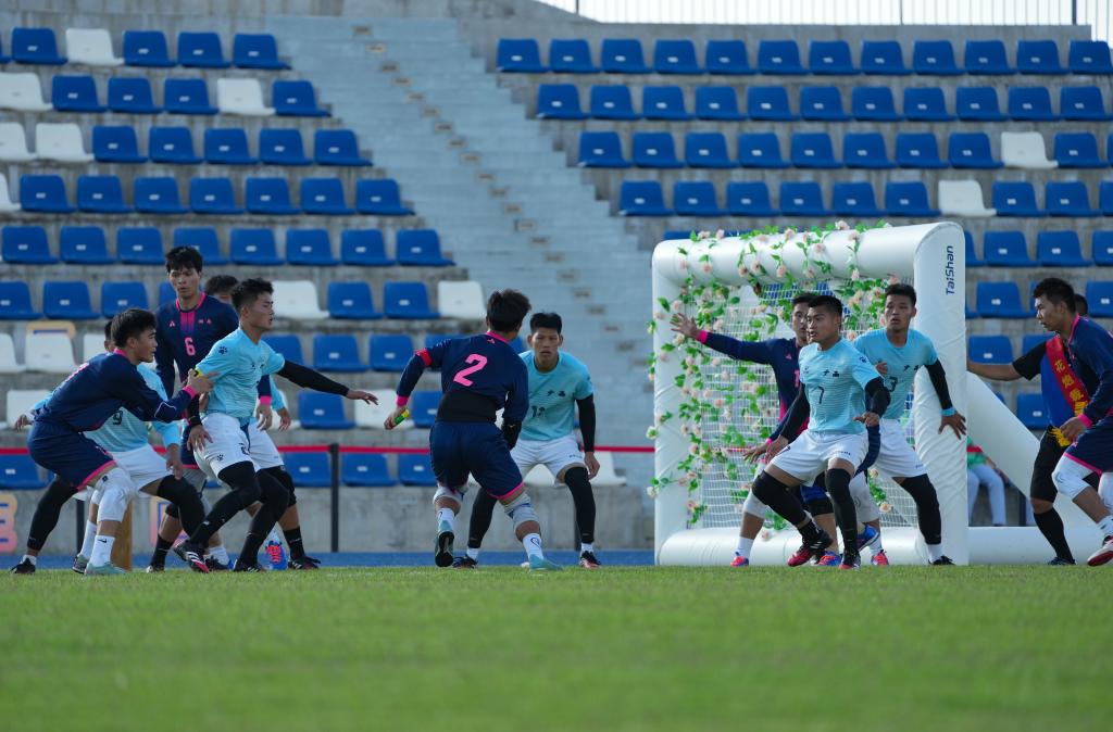 2019年9月14日,广西队队员韦凯旋(中)在比赛中争抢。当日,在河南郑州举行的第十一届全国少数民族传统体育运动会花炮项目决赛中,广西队以4比3战胜北京队。新华社记者 李安 摄