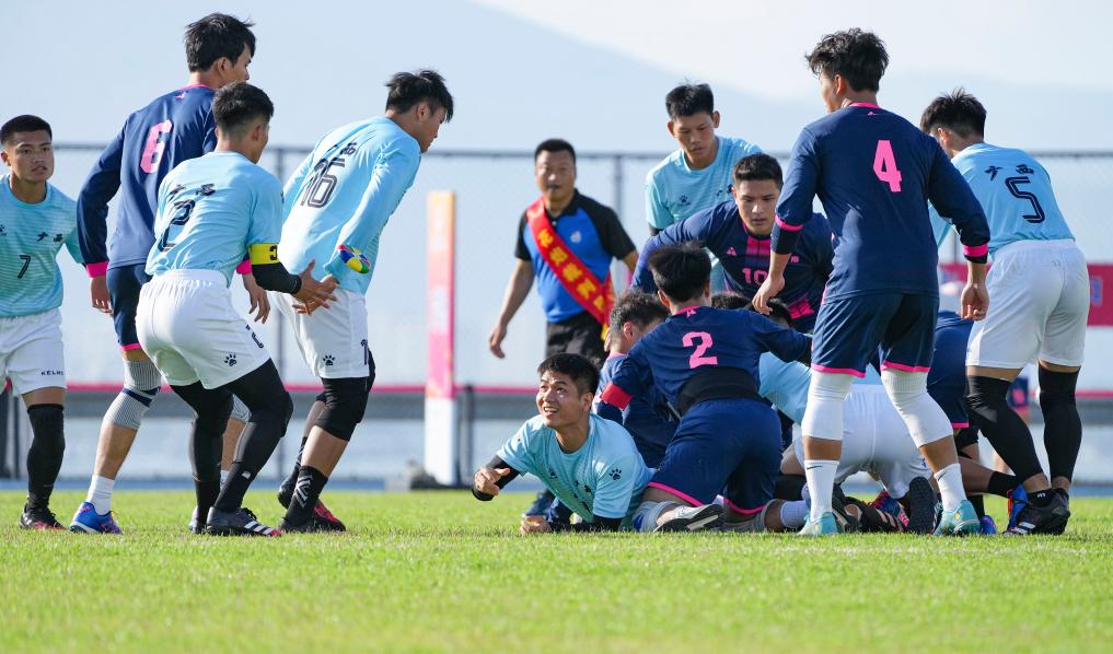 11月23日,广西队选手覃振宇(下)倒地传出花炮。新华社记者 晋美多吉 摄